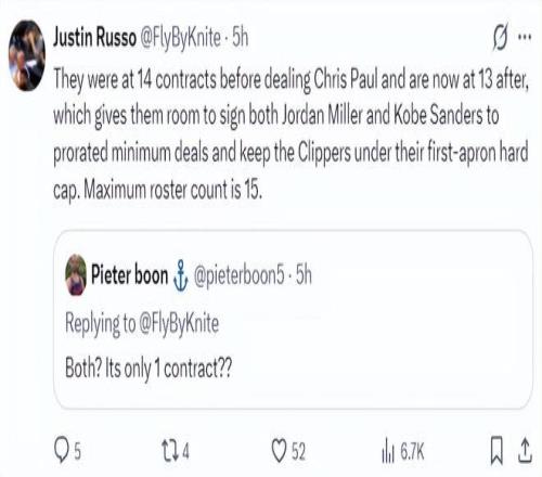 快船队一直有意将桑德斯、乔丹米勒两位双向条约球员的条约转为正式条约,送走保罗后台甫单只剩下13人正好可以转正这两位精彩的年轻小将。并且乔丹-米勒、科比-桑德斯两人的条约会转为最低的新秀条约,这样快船可以坚持在第一奢侈税征点之内。