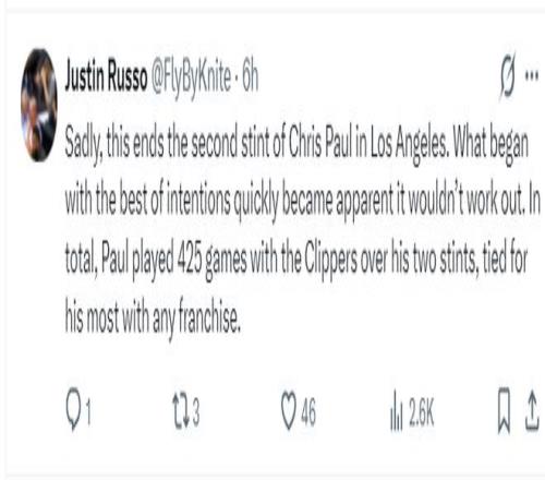 这笔生意爆发后,快船记者Justin Russo写道:保罗在快船的生涯就此终结,令人遗憾。早先双方都希望朝着理想的偏向生长,但很快彰显出矛盾无法延续下去。保罗职业生涯为快船出战425场角逐,这一数字是他效力过的任何球队中最高纪录。
