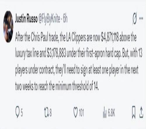 跟关于快船来说送走保罗利好太多了,保罗的生意完成后,快船的总薪资凌驾奢侈税线4871118美元低于硬帽3178883美元,快船现在包管名单只有13份,球队需要在两周内签下一人知足同盟最低14份包管名单的最低门槛。