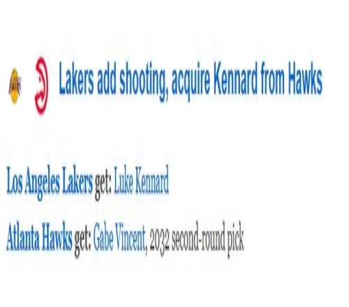 北京时间2月6日,在NBA的生意阻止日,湖人完成了一笔2换1的生意,送出文森特和一个2032年的次轮签,从老鹰获得神射手肯纳德。随后ESPN对这笔生意举行评级——