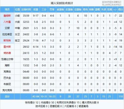 湖人队:詹姆斯22分6板10助、斯玛特19分3板3助2断、里夫斯16分2板7助、拉拉维亚14分4板1助、八村塁12分5板2助、海斯12分4板1助、肯纳德7分1板1助、艾顿6分10板、范德比尔特2分2板