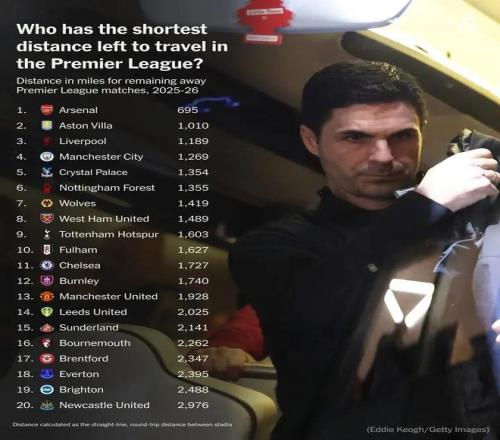 英超球队本赛季剩余客场旅程排行(以直线往返距离盘算):