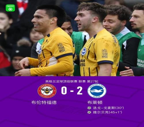 北京时间2月21日 ,英格兰足球顶级联赛第27轮 ,布伦特福德主场对阵布莱顿 。角逐中 ,迭戈-戈麦斯、维尔贝克划分破门 。最终 ,布伦特福德0-2不敌布莱顿 。
