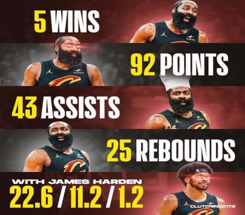 哈顿时代才刚打5场,骑士就拿下5场胜利。哈登现在状态简直疯了,作为顶级指挥官掌控全场,正是骑士迫切需要的那种大脑。这5场胜利,哈登一共获得92分43助攻25篮板,场均数据是18.4分8.6助攻5.0篮板,投篮掷中率49.1%,三分掷中率48.1%。