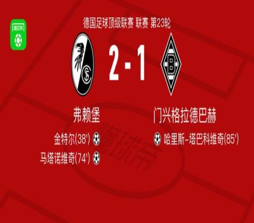 北京时间2月22日德国足球顶级联赛 联赛 第23轮 ,弗赖堡主场对阵门兴格拉德巴赫。弗赖堡金特尔破门 ,马塔诺维奇破门。门兴格拉德巴赫哈里斯-塔巴科维奇破门。最终比分弗赖堡 2-1 门兴格拉德巴赫。