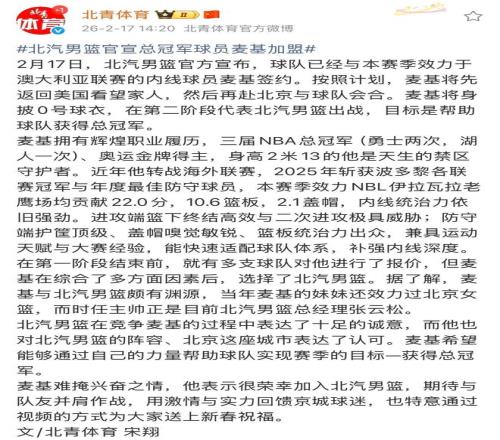 加盟北京男篮,麦基很是激动,录制了视频向北京球迷送上新春祝福!首钢俱乐部在竞争麦基的历程中表达了十足的至心,麦基也对北汽男篮的阵容、北京这座都会表达了认可,麦基希望能够通过自己的实力资助球队实现赛季的目的—获得总冠军 。
