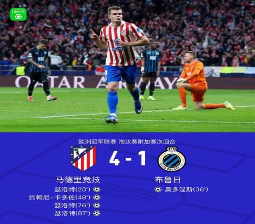 北京时间2月25日欧洲冠军联赛 镌汰赛附加赛次回合,马德里竞技对阵布鲁日。上半场瑟洛特破门首开纪录,随后奥多涅斯头球扳平比分。下半场卡多佐破门再度将比分凌驾,瑟洛特补射梅开二度将比分扩大,随后鲁杰里助攻瑟洛特抢点破门完成帽子戏法。最终比分马竞 4-1 布鲁日。两回合总比分马竞7-4布鲁日晋级16强。