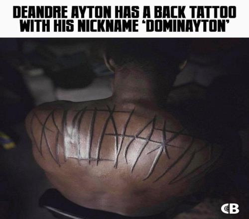 就像詹姆斯肩上的“天选之子”纹身 ,艾顿后背上也刺着一排粗犷的大写字母:“DOMINAYTON(统治顿)”。