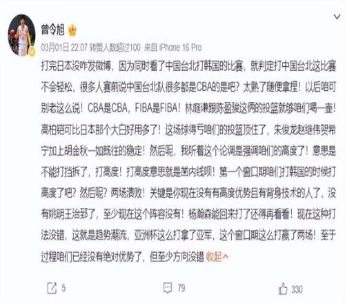 北京时间3月1日 ,中国男篮100-93击败中国台北男篮拿到二连胜 ,这世预赛第二个窗口期全胜为男篮晋级第二阶段涤讪了基础 ,七月份再赢一场就可以锁定前三的席位 。全新的阵容让男篮收获颇丰 ,我以为一大收获就是贺希宁 。