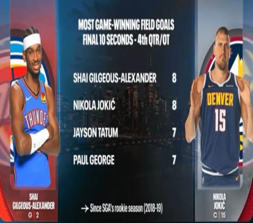 除此之外,自SGA进入同盟后,在终场前10秒内完成准绝杀/绝杀次数最多的球员是约基奇、SGA,这两人都是8次,以是要害球能力约基奇也不输亚历山大。