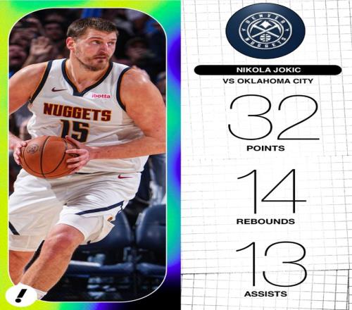 全场角逐约基奇40分钟,19中12,三分6中3,罚球6中5,拿到32分14篮板13助攻1盖帽,掷中率63.2%,三分掷中率50%,正负值+2。