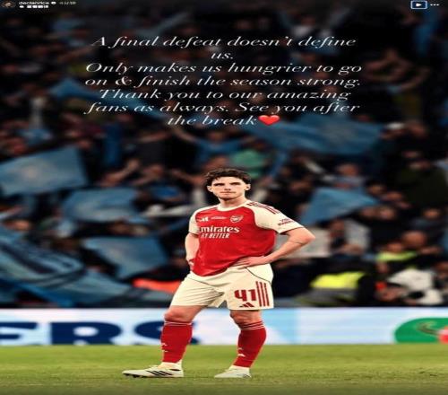在英联杯决赛0-2输给曼城后,阿森纳中场赖斯今日更新社交媒体勉励球队。
