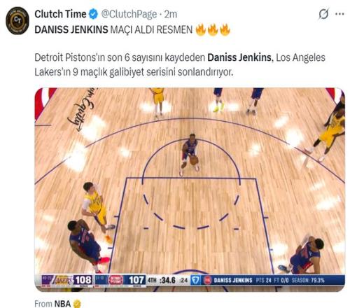 这一球掷中后 ,东契奇终场前12秒急停中投不中 ,终场前9秒詹金斯控制球权后被犯规 ,他两罚全中领先到3分 ,东契奇绝平三分三不沾 ,终场前34秒-9秒这25秒里就是詹金斯一人大战湖人全队。
