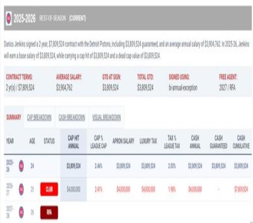 今年2月9日活塞才将詹金斯的双向条约转为正式条约 ,他现实上在2024年落选后就一直代表活塞出战G联赛/NBA ,上赛季只打了7场角逐 ,但本赛季已经成为活塞焦点轮换已经出战61场。本赛季薪水为380万(双年特例签约)