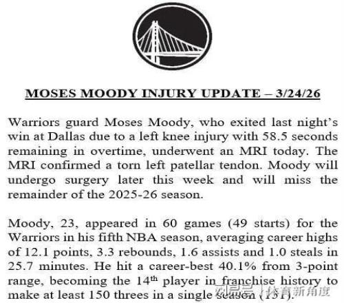 最坏的情形已然爆发,虽在预料之中,但仍令人惋惜  。据着名体育记者Shams披露,穆迪不幸遭遇左膝髌腱撕裂,将提前竣事本赛季的所有赛程  。另一位资深记者Siegel进一步增补称,预计穆迪还将缺席2026-2027赛季的大部分角逐  。随后,勇士队官方宣布声明,确认了这一新闻的真实性  。