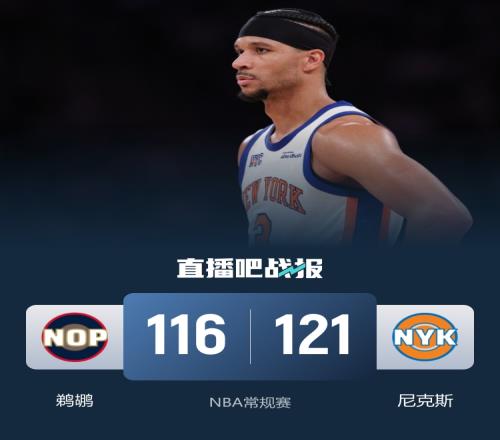 角逐最先,鹈鹕进攻端多点着花打得很自动,布伦森攻传带队咬住比分,双方睁开拉锯战,最后3分钟尼克斯轰出15-0领先到14分,次节尼克斯断电4分钟仅得2分,鹈鹕18-2攻击波一度反超,随后尼克斯接连外线回应,半场尼克斯守住5分领先。下半场,鹈鹕上来再次追平比分,尼克斯一连三分止血,鹈鹕全民皆兵再回应,双方又睁开胶着拉锯战,三节尼克斯仅领先1分,小节双方比分照旧拉不开,布伦森一连取分资助尼克斯领先两球以上,最后时刻“点球大战”,德章泰·穆雷三分不中,最终尼克斯121-116力克鹈鹕。