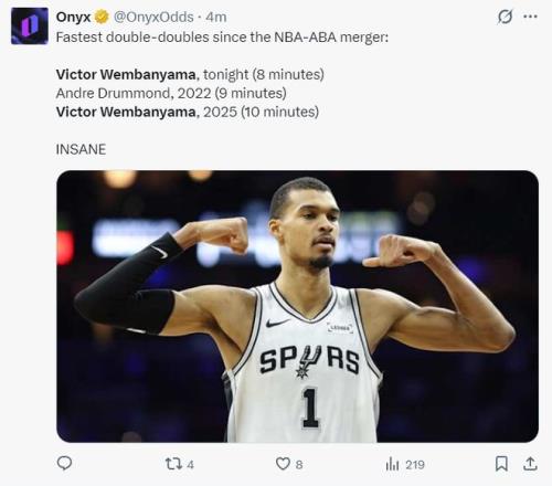 1.文班亚马8分钟完成两双,是ABA与NBA合并后最快;
