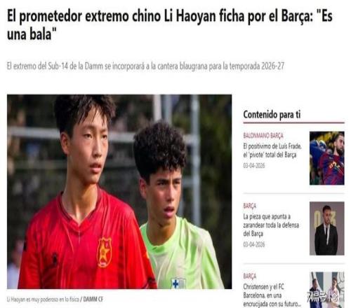 ¾Ý¡¶ÖðÈÕÌåÓý±¨¡·±¨µÀ£¬14ËêÖйúС½«Àîê»Ñ×½«ÔÚÏÂÈü¼¾¼ÓÃ˰ÍÈøU15ÌݶÓ¡£Àîê»Ñ×˾ְ±ß·æ£¬ÏÖÔÚЧÁ¦´ïÄ·U14ÌݶÓ¡£±¾Èü¼¾´òÈë8Á£½øÇò£¬ËÙÂʼ«¿ì£¬¹¥»÷Á¦³¬Ç¿¡£