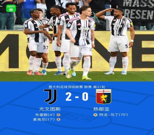 北京时间4月7日00:00 ,意甲第31轮 ,尤文图斯主场对阵热那亚 。上半场 ,布雷默头球破门 ,随后孔塞桑助攻麦肯尼推射扩大比分 ,半场竣事前 ,麦肯尼近距离敲门将球踢高错失良机 。下半场 ,乔纳森-戴维抽射击中立柱 ,布雷默禁区内送点 ,下半时替补登场的迪格雷戈里奥将阿龙-马丁的点球扑出 ,最终 ,尤文2-0战胜热那亚 ,距离欧冠区1分 。