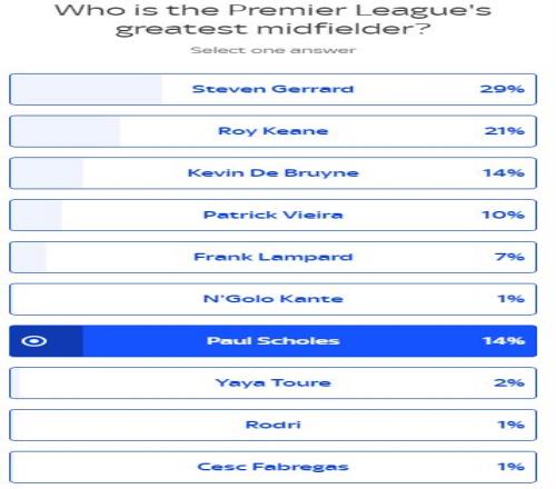 在球迷投票环节,杰拉德同样以29%的得票率排名榜首,其次则是罗伊-基恩(21%)。斯科尔斯、德布劳内同样获得14%的投票。从这一投票效果来看,球迷在斯科尔斯的历史职位上无法认同卡拉格的看法。