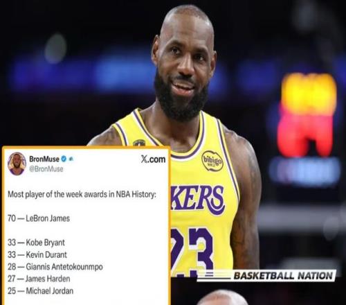 依附这次周最佳 ,詹姆斯职业生涯周最佳次数来到70次 ,高居历史第一。