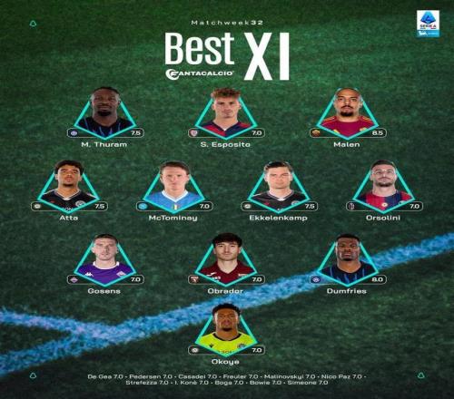 ±±¾©Ê±¼ä4ÔÂ14ÈÕ£¬Òâ¼×¹Ù·½Ðû²¼ÁËÁªÈüµÚ32ÂÖµÄ×î¼Ñ11ÈËÕóÈÝ£¬±¾ÂÖ˫˫Íê³É÷¿ª¶þ¶ÈµÄÂí¿â˹-ͼÀ­Ä·ºÍµË¸¥Àï˹ÁìÏΣ¬ÂíÂס¢Âó¿ËÍÐÃ×ÄΡ¢¸êɭ˹ÒÔ¼°Èû°Í˹µÙÑÇŵ-°£Ë¹²¨Î÷ÍÐÔÚÁÐ ¡£
